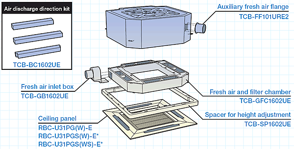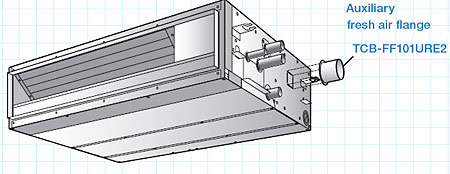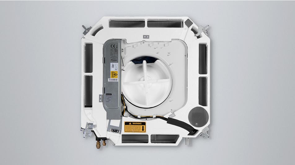Our modern ceiling cassette air cond blend seamlessly into your surroundings. If you want fresh air you have no the ceiling cassette does allow an attachment of 4 duct for fresh air intake, but no exhaust. Celing concealed ducted unit with fresh air intake. The absolute solution for business environments with low height. This market leading air sterilisation technology works towards the inhibition of bacteria. The air outlet from 8 points offers high levels of comfort and efficiency. The indoor ceiling cassettes have a fresh air intake port for ventilation.