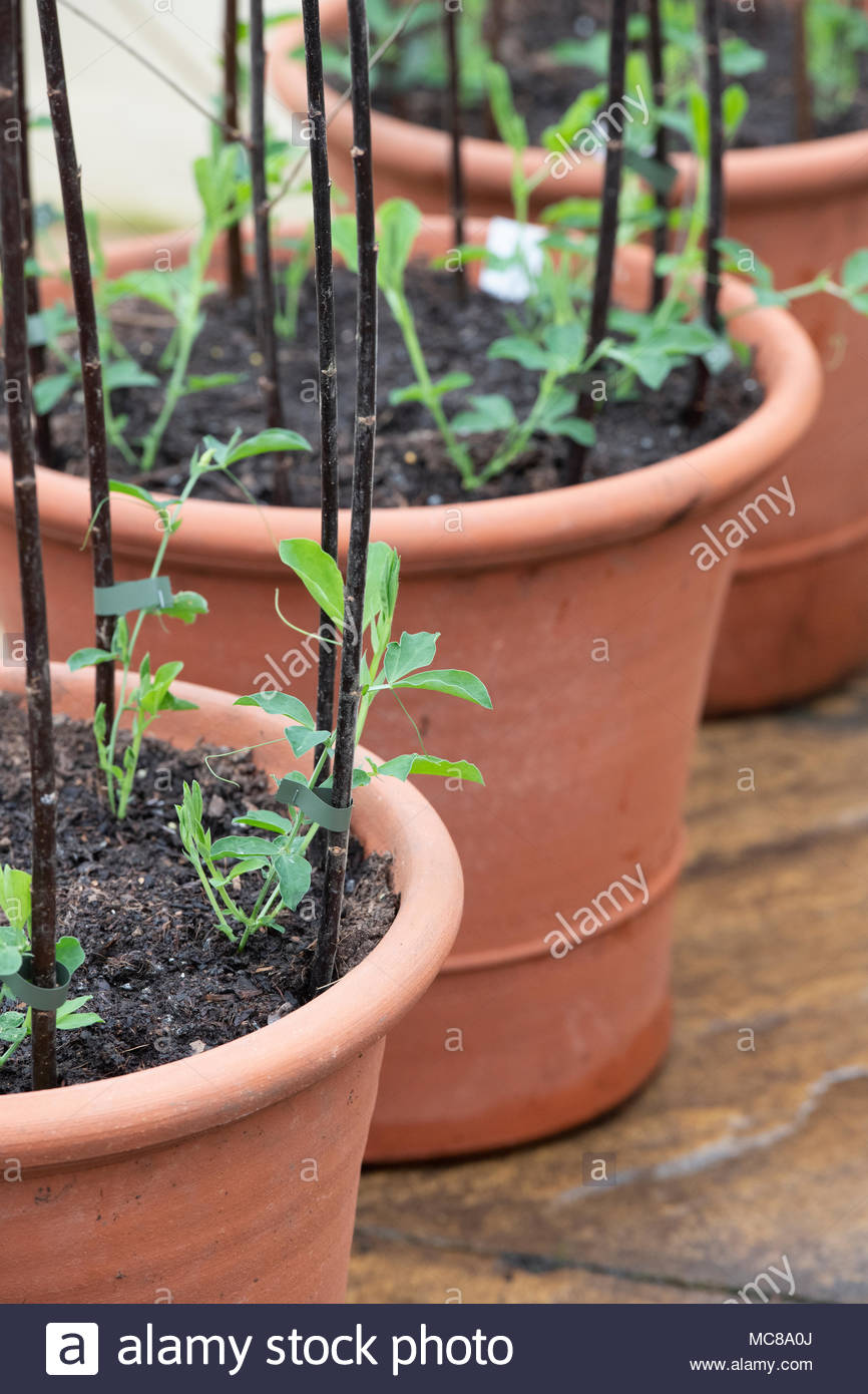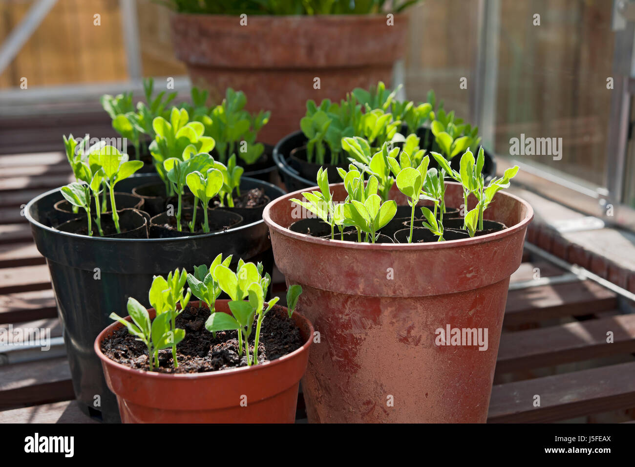 Pots Of Young Sweet Pea Seedlings Plants In The Greenhouse